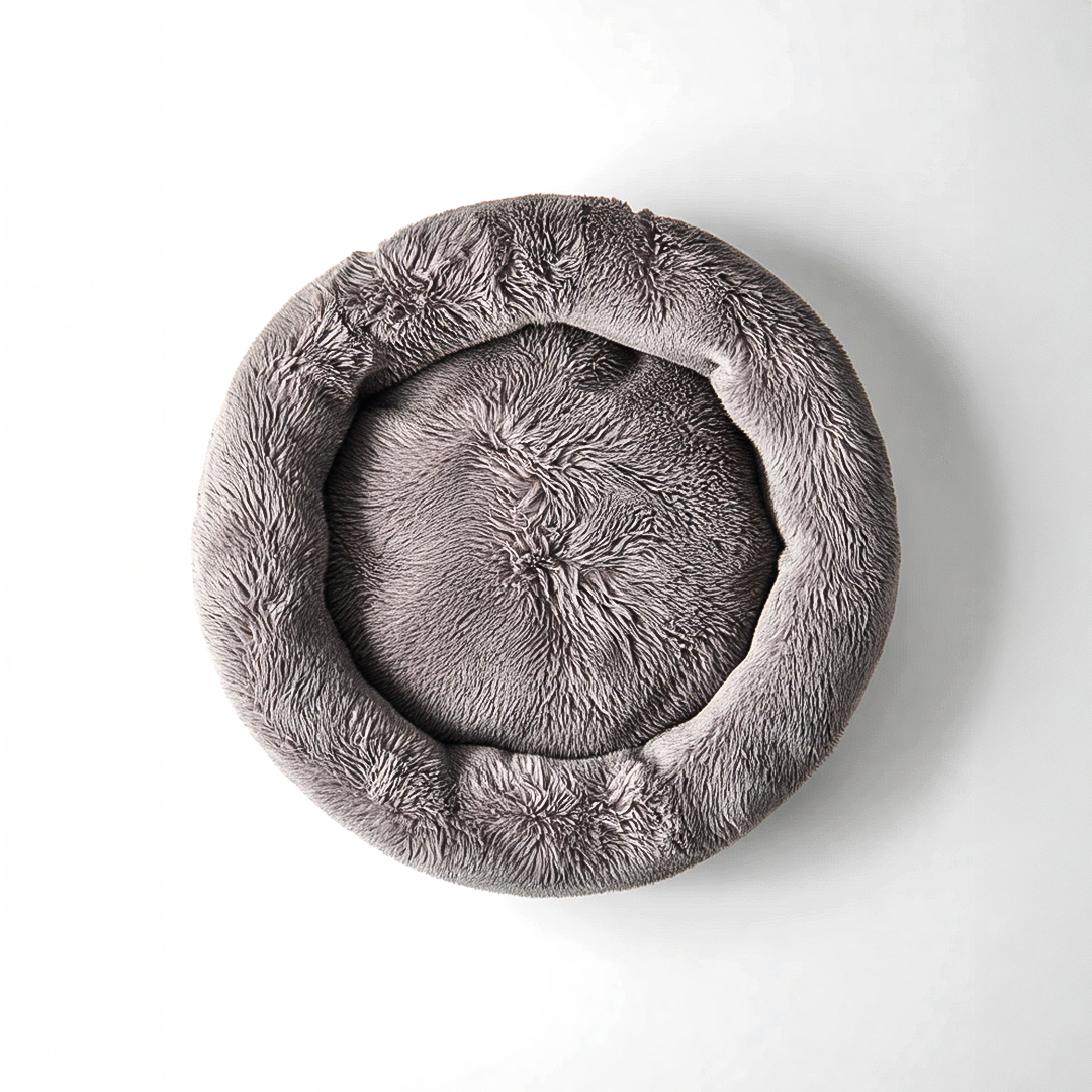 Calming donut-style bed with ultra-soft faux fur exterior, plush cotton filling, and waterproof Oxford base. Removable, machine washable cover makes cleaning a breeze.